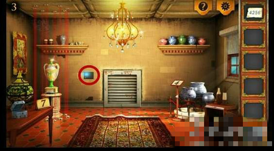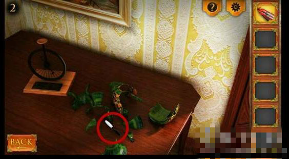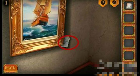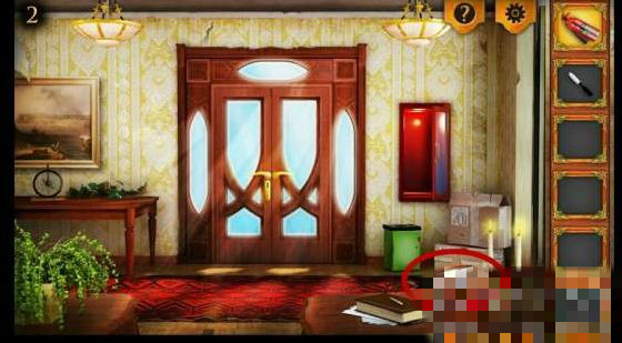 依次點(diǎn)擊紅圈所示5處地方,首先撿起上1號(hào)圈所示的第1頁(yè)紙,最后點(diǎn)擊門左邊的控制板。