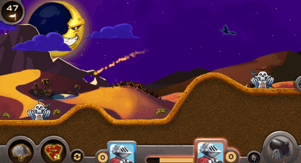 《火炮戰(zhàn)爭 Artillery》是一款在線單挑的休閑游戲,沒有道具,也不能移動,你所需要做的只有根據(jù)風(fēng)向調(diào)整發(fā)射方向和力度即可發(fā)射炮彈攻擊對方的城堡,擊中對方城堡三次即可獲勝。亮點就在于在線單挑和模式簡單了,游戲畫面精美,設(shè)計簡單,比較容易上手,值得試下!