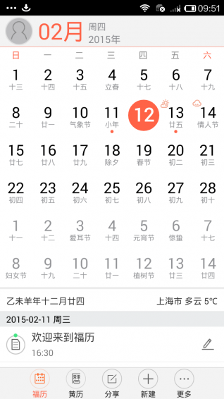 福歷,經(jīng)典日歷界面,黃歷頁面提醒方便您獲得宜忌信息,最專業(yè)的日程管理,安排生活更簡單,天氣提醒方便您出行,提醒:人性化提醒功能,重要事件不再錯過分享幸福:隨時分享好玩開心的日歷和活動到微信、微博、QQ,幸福是從福歷分享而來的。除了這些還不夠,還有更多驚喜等你發(fā)掘!【更新日志】