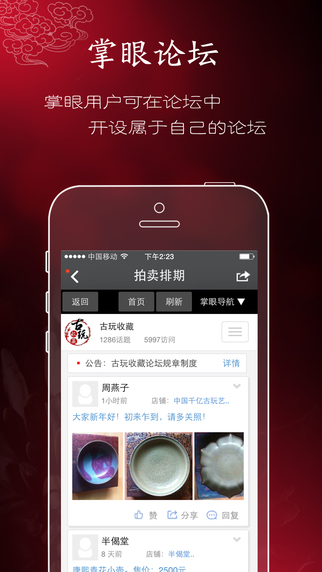 掌眼資訊:隨時(shí)關(guān)注國內(nèi)外古玩收藏相關(guān)資訊。古玩交流:開設(shè)了不同的收藏分類,根據(jù)藏友興趣方向定向交流,設(shè)置了專業(yè)的權(quán)限規(guī)則,圈子外或國寶幫打擾不到專業(yè)藏友。
