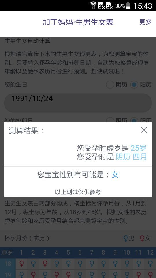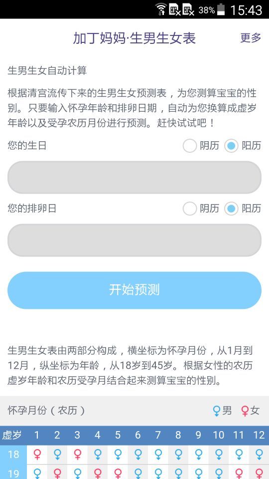 1.輸入生日和排卵日就能計(jì)算出寶寶性別2.提供了18~45歲不同懷孕月份下寶寶性別預(yù)測(cè)表