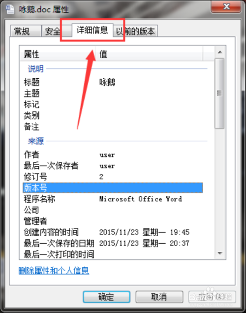 七、在文檔的“屬性”對(duì)話框中,將選項(xiàng)卡切換到“詳細(xì)信息”選項(xiàng)卡。如圖所示;