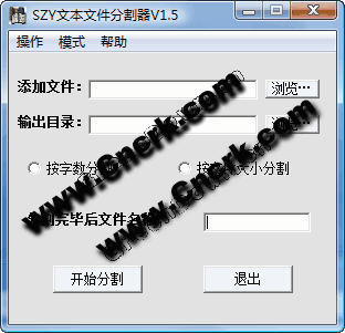 SZY文本文件分割器 V1.5 簡體中文綠色免費(fèi)版 此版本修正了一個很大的BUG~,把原來漏分的地方修改了!并且新添按空間大小分割的功能?,F(xiàn)在可以按字?jǐn)?shù)和大小兩種方法分割了!