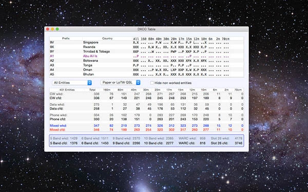 RUMlogNG Mac版作為QSL處理和印刷工具,對短波DXer特別制作,由DXer作出?;救罩居涗浌δ芏及诟哳l段可達(dá)1.2厘米,而衛(wèi)星。 RUMlogNG可以處理無限數(shù)量的日志和不限數(shù)量的每個日志類星體的。 Clublog數(shù)據(jù)用于自動DXCC識別。使用RUMlogNG可以打印的卡片標(biāo)簽和管理你的來電分析表。全世界的航海日志(裝載拖車或貨車)和電子收聽完全支持,你可以創(chuàng)建文件為全球的卡片服務(wù)很快。