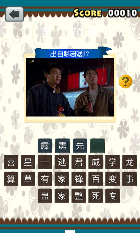 星爺歸來(lái)手游是一款休閑類游戲,游戲中收錄了星爺所有早年的經(jīng)典電影,并為玩家提供其中一張圖片,讓玩家猜電影的名稱,如果你是星爺?shù)蔫F桿粉絲,就來(lái)挑戰(zhàn)一下自己能猜中幾個(gè)電影。