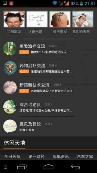 愛(ài)頭發(fā)app是一款頭發(fā)相關(guān)資訊軟件,這里是關(guān)愛(ài)頭發(fā)社區(qū),用戶(hù)能夠在這里學(xué)到很多養(yǎng)護(hù)頭發(fā)的小技巧,還有脫發(fā)的治療方法,幫助用戶(hù)解決一切頭發(fā)的方面的問(wèn)題。