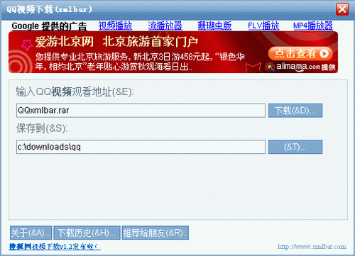 QQ視頻下載(xmlbar)是一個(gè)專門用于下載QQ視頻到本機(jī)硬盤上的小軟件。它不但完全免費(fèi)而且不含有任何插件,可以完全干凈卸載。用戶只需輸入需要下載的QQ視頻的觀看頁面地址并按下下載按鈕,或者更方便的使用拖放方法將頁面地址從瀏覽器地址欄拖到本軟件的浮動(dòng)窗口,它就會(huì)自動(dòng)識(shí)別后進(jìn)行下載,下載的文件格式為flv。更好的是它還支持多個(gè)QQ視頻文件同時(shí)下載,并能顯示出真實(shí)的QQ視頻文件的下載地址,下載完后您還可以選擇馬上播放,而且它還有查看管理下載歷史記錄的功能