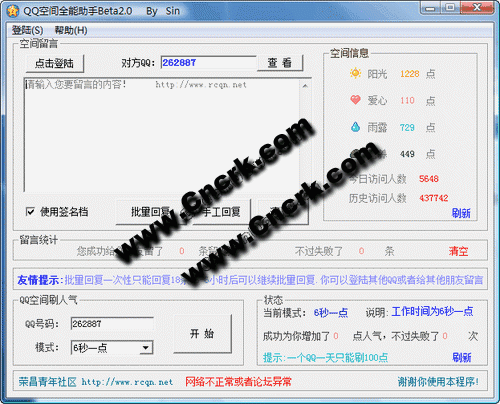 主要功能: 1.批量刷留言。 2.刷人氣 3.有4種刷人氣模式 4.快速查看QQ空間信息 5.一個QQ限制1天只能刷100點(diǎn)