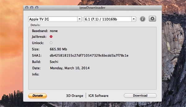 選擇需要下載的系統(tǒng)固件版本,ipswDownloader會顯示該固件的大小、是否支持越獄、SHA1碼等信息,點擊Download即可下載了。