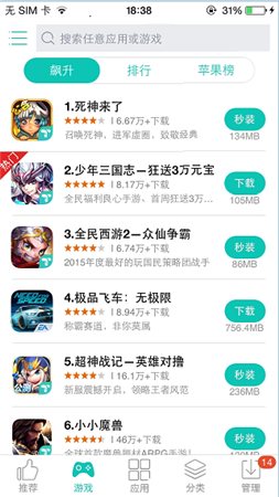 2、進(jìn)入游戲頁(yè)面,我們可以看到最新飆升、排行以及蘋(píng)果榜的相關(guān)游戲信息。
