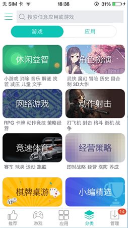 4、進(jìn)入到分類(lèi)頁(yè)面,用戶(hù)可以根據(jù)游戲或軟件的分類(lèi)來(lái)查找安裝應(yīng)用。