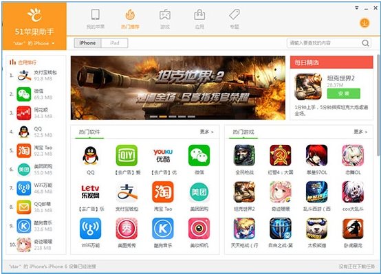 51蘋果助手可以輕松的對蘋果手機應(yīng)用與數(shù)據(jù)進行管理,其中包括應(yīng)用、游戲、短信、電話、圖片、視頻等等。該助手還提供了各種正版的手機應(yīng)用讓大家免費下載使用,界面十分的簡潔,功能非常的強大。