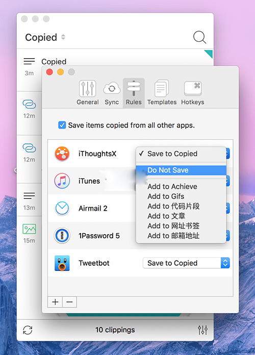 我們可以對(duì)任意軟件設(shè)置Copied的應(yīng)用范圍,比如默認(rèn)情況下Copied可以從所有應(yīng)用程序內(nèi)收集ClipboardItems,但你也可以將不希望記錄剪切板內(nèi)容的目標(biāo)軟件進(jìn)行排除,或者是將某個(gè)軟件的Clipbaord內(nèi)容歸入指定List管理。