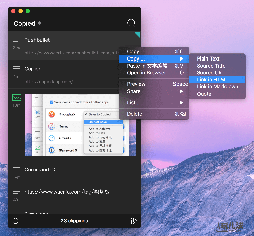 Copied是一款非常實(shí)用的mac剪切板工具,它能夠幫你記錄下每一個(gè)文本、超鏈或是圖片,如果你在其他設(shè)備上也下載了Copied,即可實(shí)現(xiàn)剪切板內(nèi)容同步,為你的辦公帶來(lái)更多的幫助。