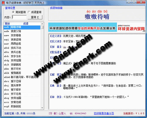 專業(yè)成語資料電子詞典,當前收集成語萬余條。它包含的資料是國內同行業(yè)之首,每條成語都拼音、近義詞組、反義詞組、歇后語、燈謎、用法、英文解釋、中文解釋、成語出處、應用舉例、成語故事、拼音簡碼、常用程度、產生年代、詞語結構、詞性、筆畫數(shù)等17項資料。