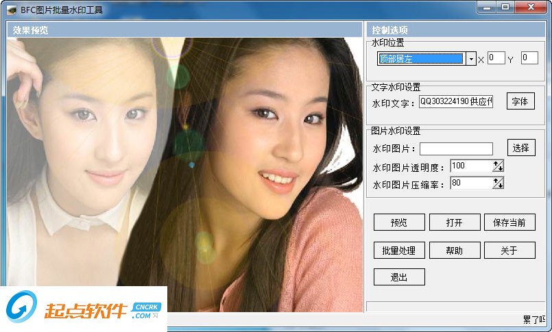 旋風(fēng)圖片批量刪除添加水印專家是一款免費(fèi)的圖像添加水印 刪除水印 轉(zhuǎn)換、縮放軟件。它還可以進(jìn)行批量改名、裁剪、旋轉(zhuǎn),批量變換顏色深度,以及批量給圖片增加文字水印。