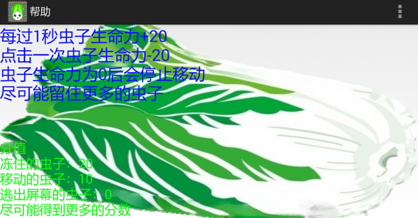 打蟲(chóng)子是一款簡(jiǎn)單有趣的休閑益智類手機(jī)游戲。游戲講述可惡的害蟲(chóng)一直在禍害那些無(wú)辜的蔬菜,為了保護(hù)他們安全的成長(zhǎng),你必須喂他們吃有毒的白菜,讓它們不能快速生長(zhǎng)蔓延,從而使得人類都能吃上健康綠色的蔬菜。