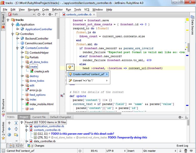 RubyMine用有專門的RoR項目架構(gòu)視圖,快速的Model-View-Controller導(dǎo)航選項,Rails特定代碼完成,感知動作以及重構(gòu)。