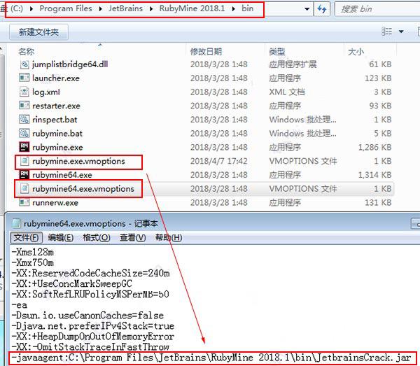 7、再用記事本打開“rubymine.exe.vmoptions”和“rubymine64.exe.vmoptions”這兩個文件,再后面添加破解文件的路徑,就是中括號中的內(nèi)容【-javaagent:C:\Program Files\JetBrains\RubyMine 2018.1\bin\JetbrainsCrack.jar】
