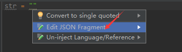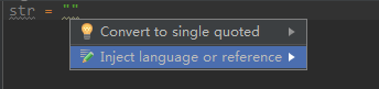 先將焦點定位到雙引號里面,使用alt+enter快捷鍵彈出inject language視圖,并選中 Inject language or reference