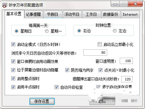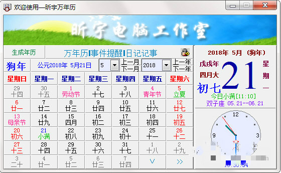 4.時鐘:本萬年歷有一個可動態(tài)顯示、隱藏的時鐘,時鐘可整點、半點報時。根據(jù)愛好還可隱藏日歷部分。在桌面上顯示一個置頂?shù)臅r鐘。這是個仿真實日歷盤的窗口,包括甲子年、陰歷大小月、星期、節(jié)氣預告、屬相、十二星座等信息。