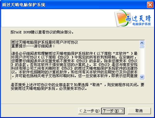 安裝時(shí),您可以直接到雨過天晴電腦保護(hù)系統(tǒng)官方網(wǎng)站上下載最新版本進(jìn)行安裝(就是本網(wǎng)站)。安裝時(shí)只需要簡單的按下一步即可順利完成安裝,非常方便簡單。以下是一些簡要介紹,供參考:用戶許可協(xié)議: