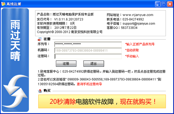 軟件注冊1.雨過天晴專業(yè)版可以免費(fèi)使用三個(gè)月,如果過期,請與本公司及各地代理商聯(lián)系購買正式版軟件序列號(hào),只有購買了正式版后才能注冊成功繼續(xù)使用。