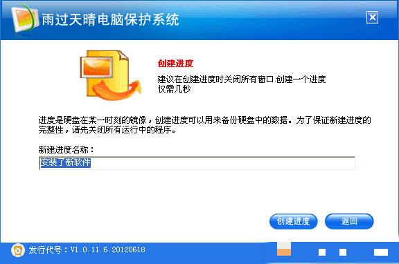 創(chuàng)建進(jìn)度從技術(shù)角度講,進(jìn)度是一張硬盤扇區(qū)圖和這張圖的索引系統(tǒng);實(shí)際上,進(jìn)度就是硬盤保護(hù)分區(qū)在某一時(shí)刻的鏡像。進(jìn)度是雨過天晴專業(yè)版工作的基礎(chǔ),恢復(fù)系統(tǒng)等操作都需要曾經(jīng)創(chuàng)建過進(jìn)度。您需要在需要的時(shí)刻創(chuàng)建進(jìn)度,記錄當(dāng)時(shí)的系統(tǒng)狀態(tài),做到有備無患。