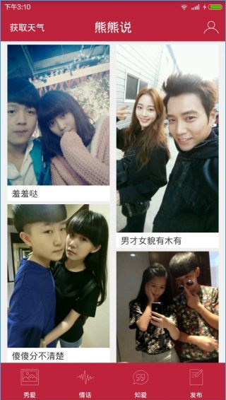 熊熊說(shuō)app是一款可以無(wú)限分享的移動(dòng)應(yīng)用,用戶可以把自己的幸福曬給熊熊,把你的情話說(shuō)給熊熊聽(tīng),把你的小困惑也可告訴熊熊,熊熊幫你解答哦。熊熊是你的好朋友,你也可以和他分享你的小秘密。【軟件特點(diǎn)】