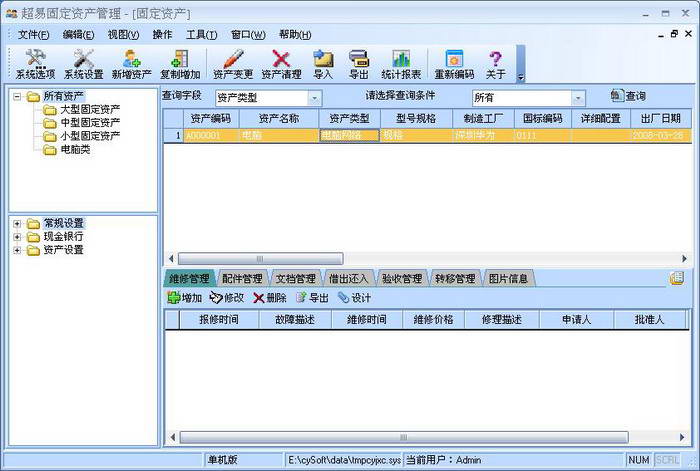 超易固定資產(chǎn)管理軟件是綠色軟件,無插件,免安裝,下載后解壓即可使用!超易固定資產(chǎn)管理軟件是目前國(guó)內(nèi)性價(jià)比最高的,最好的固定資產(chǎn)管理軟件,相比同類型軟件具有界面美觀大方,功能強(qiáng)大而操作簡(jiǎn)單,自定義功能特別強(qiáng)大,是目前國(guó)內(nèi)唯一一款提供超級(jí)強(qiáng)大自定義功能的固定資產(chǎn)管理軟件。【軟件特點(diǎn)】