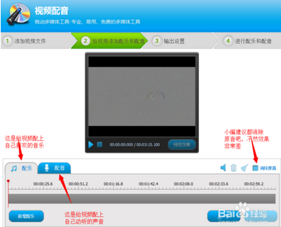 這一步,要注意到配樂(lè)和配音。配樂(lè)是指給視頻配上音樂(lè);配音是指給視頻配上聲音,例如把原視頻的對(duì)白聲音去掉,配上自己的。這該是件多偉大的事呀。小編建議都選擇【消除原音】。完成后,點(diǎn)擊【下一步】。