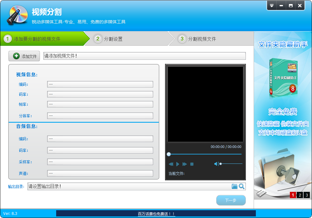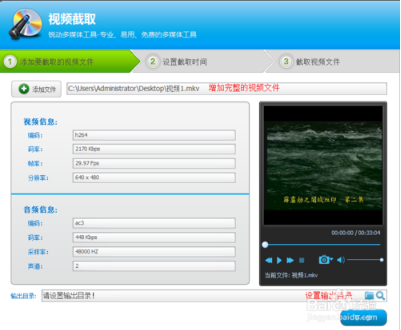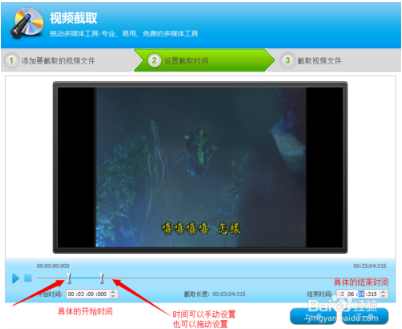 截取文件時(shí)間選擇。比如說(shuō):你覺(jué)得從電影的第3分鐘到第6分鐘04秒的這一段非常精彩,那就把時(shí)間設(shè)置后,點(diǎn)擊【下一步】即可。
