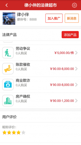 5.法律超市助力律師業(yè)務(wù)拓展:律師自主定價(jià)發(fā)布個(gè)性化產(chǎn)品;選擇加入律伴“推廣計(jì)劃”,暢享多種方式大力推廣。
