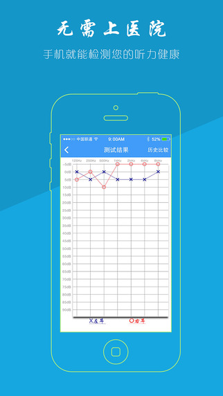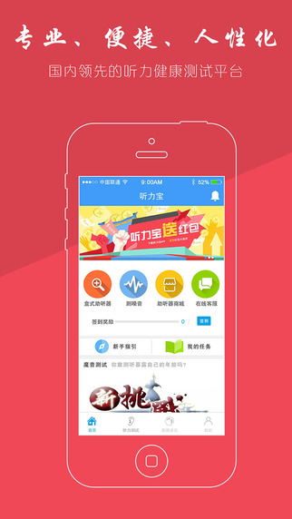 聽力寶,世界上第一款能準(zhǔn)確測試聽力的手機(jī)軟件,能讓用戶快速、方便、精確的了解自己的聽力現(xiàn)狀。在解放軍總醫(yī)院聽力專家的指導(dǎo)下,通過大量的臨床實(shí)驗(yàn),系統(tǒng)對多款手機(jī)進(jìn)行了精準(zhǔn)的校準(zhǔn),保障了手機(jī)初步測試結(jié)果的準(zhǔn)確率。