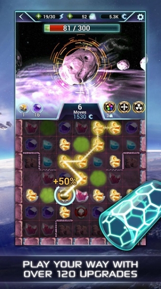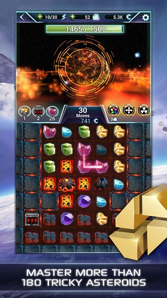 《紀元2205: 小行星礦工(ANNO 2205 Asteroid Miner)》是一款趣味十足的三消游戲,玩家只要在場上布滿寶石的地方,將相同寶石連成一線,便能夠消除。游戲每一關(guān)都設(shè)置了不同任務(wù),包括收集特定數(shù)量的寶石,擊破正在撞過來的隕石等。玩家需要在限定回合數(shù)內(nèi)完成任務(wù),否則便會輸?shù)?。玩家在任?wù)中獲得的資源能夠用來開發(fā)太空站,獲得特殊能力。