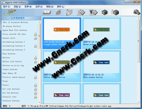 Agama Web Buttons V2.60 漢化綠色特別版 Agama Web Buttons 是一款能讓你只需幾分鐘的時間創(chuàng)建專業(yè)的,高質量的,獨特的2D/3D形式的WEB按鈕的工具,有透明/金屬/自定義/XP模式。它在25個web按鈕包里擁有超過150個按鈕模塊為你使用。