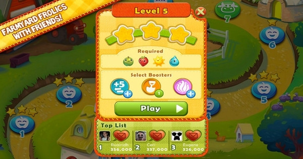 玩家可以在游戲中通過不停地完成關(guān)卡而從自家的小農(nóng)場(chǎng)來(lái)到春意盎然的農(nóng)莊,再到夏日繁花似鏡的農(nóng)場(chǎng)、秋天碩果累累的果園,冬天冰雪覆蓋的農(nóng)場(chǎng);更可以從白雪皚皚的冰川之地來(lái)到有著長(zhǎng)頸鹿和斑馬的沙漠樂園。多達(dá)數(shù)百關(guān)的關(guān)卡都有自己獨(dú)特的主題,這一點(diǎn)跟《粉碎糖果傳奇》也是極為相似的。但主線劇情也是比較簡(jiǎn)單的,作為農(nóng)夫,主角所做的就是要收割成熟的農(nóng)作物,保護(hù)自己的家畜不被狼和狐貍偷走。由于屬于消除類游戲,所以游戲的故事性并不是特別強(qiáng)也是在意料之中的。