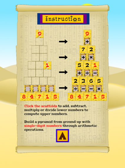 《數(shù)字法老 Number Pharaoh》是一款休閑游戲,古埃及的法老正在監(jiān)督人們建造金字塔,使用加減乘除進行運算,創(chuàng)造更高一層的金子塔,最終得到金字塔頂端的數(shù)字即可獲勝。