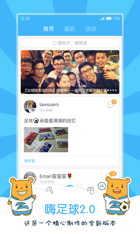 “嗨足球”(hisoccer)是一個High爆的足球社區(qū)!在這里,既可以加入各種草根、校園球迷會,也可以管理你們的賽程、球隊、球員,還可以用積分競猜你的比賽、兌換豐富的足球禮品。如果你是學生球迷,可以加入你學校的球迷會;如果你是草根組織,可以向我們申請屬于你們的球迷會;如果你有點害羞,可以每天靜靜地賺取積分;如果你自信會玩,可以用照片DIY你的球迷海報;如果你是收藏控,可以用積分兌換你心儀的球隊禮品;如果你是情懷君,可以每天和嗶嗶俠一起對足壇嬉笑怒罵;如果你熱愛踢球,這里有最專業(yè)的戰(zhàn)術(shù)和裝備文章;如果你熱愛看球,這里有可以聊通宵的足球話題;如果你是男生,那你的加入會讓這里的男女比例接近1比1;如果你是女生,則很有可能成為我們《女球迷專訪》的主角;無論你是誰,我們只希望讓你感受到足球帶來的快樂。