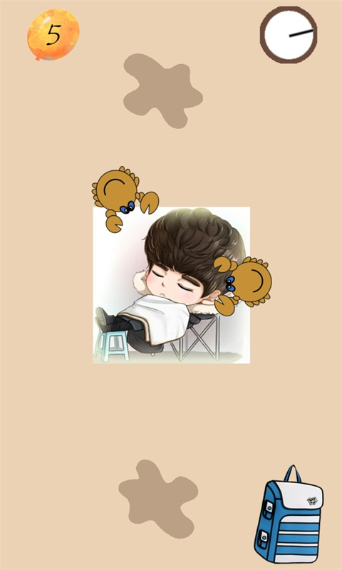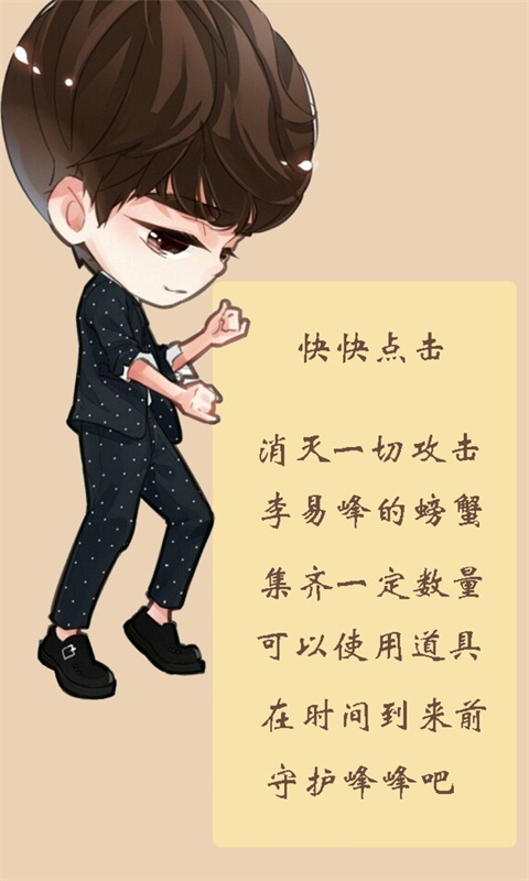 峰峰別怕手游是一款以小鮮肉李易峰為游戲題材的休閑手游,這款游戲畫面清新,玩法簡單,在游戲中,玩家需要不停的點(diǎn)擊屏幕來保護(hù)他,以防小螃蟹們來打擾峰峰睡覺。