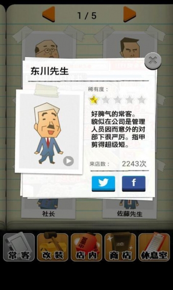 今晚也在那里的酒館里、愛情故事再次開花…在居酒屋的舞臺上、收集大叔的放置系登場!「我、有了喜歡的人」游戲操作簡單。經(jīng)過一定時間后對積攢起來的大叔們點擊并滑動、就會獲得營業(yè)額。積攢好一定的資金、就能開發(fā)新的菜單、變更服裝、對店面進行改造!收集吧:大叔酒館是一款日系風格的模擬類經(jīng)營手機游戲,游戲中你將萌萌噠的大叔一起經(jīng)營這家酒館,你要將這家酒館經(jīng)營起來并且發(fā)揚光大哦!