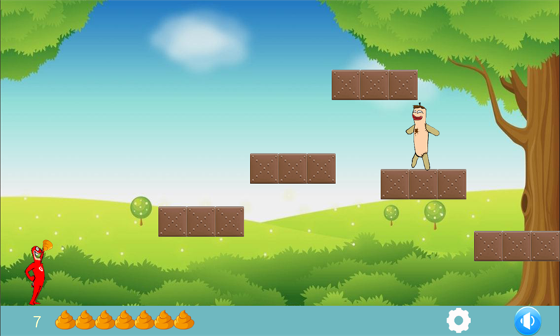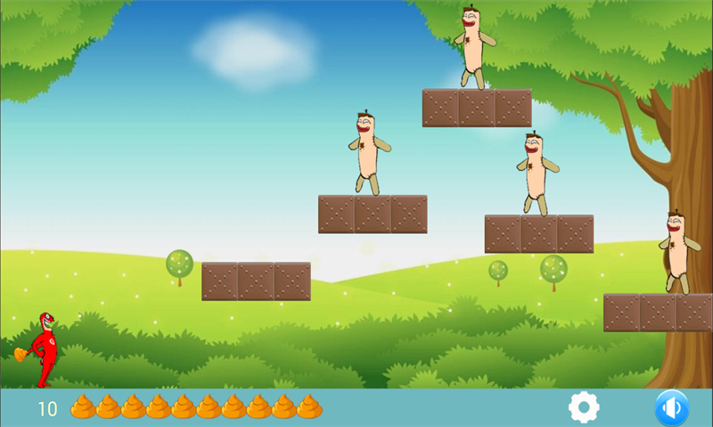 大便大戰(zhàn)是一款非常適合小孩子玩的游戲,它的操作十分簡(jiǎn)單,只需要按住屏幕調(diào)整手臂角度松開以后擲出大便就可以了。它是由一個(gè)像咸蛋超人的人偶來擲出大便來擊倒示威的怪獸,通過逐漸擲出大便將怪獸一一打倒,要記住的是大便的數(shù)量是有限的,確保每一個(gè)大便都能擊倒一個(gè)怪獸人偶,這很考驗(yàn)?zāi)銛S出的角度,高的擊倒率,過關(guān)的機(jī)率就越高。關(guān)數(shù)越高越刺激喔!等你來闖關(guān),精彩的游戲等你玩。