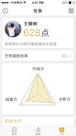 不用走出校園,通過堂口APP平臺(tái),學(xué)生完成越多的任務(wù),就能累積越多的實(shí)習(xí)經(jīng)驗(yàn)。這些經(jīng)驗(yàn)值會(huì)以習(xí)點(diǎn)方式記錄,讓學(xué)生清晰掌握自己的成長(zhǎng)軌跡。