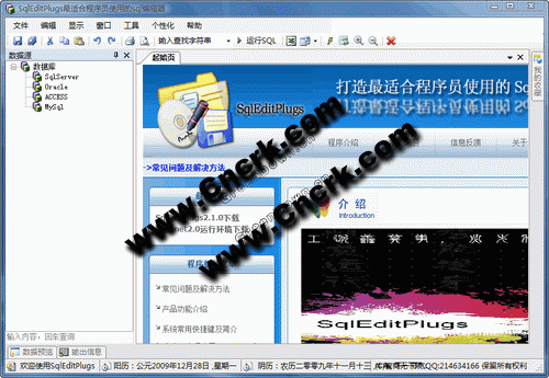 SqlEditPlugs V2.1.0 簡(jiǎn)體中文綠色免費(fèi)版 Sqleditplugs是一款小巧強(qiáng)悍、免費(fèi)綠色的國(guó)產(chǎn)Sql編輯軟件,其功能毫不遜色于國(guó)外的收費(fèi)類軟件。支持同時(shí)在多個(gè)數(shù)據(jù)庫(kù)間同時(shí)操作。結(jié)合企業(yè)管理器和查詢分析器的功能,支持智能感知,智能提示。提供像vs開發(fā)環(huán)境一樣的代碼編輯功能。