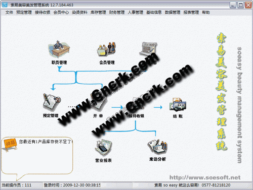 索易美容美發(fā)管理軟件系統(tǒng)是一套專門(mén)為美容院、美發(fā)店及其連鎖機(jī)構(gòu)開(kāi)發(fā)的管理軟件。該系統(tǒng)吸收了許多美容美發(fā)企業(yè)成功的管理經(jīng)驗(yàn)及管理技巧,巧妙的將電腦管理與現(xiàn)代企業(yè)管理思想結(jié)合。是集客戶預(yù)約、消費(fèi)結(jié)賬、產(chǎn)品銷(xiāo)售、員工管理和提成、會(huì)員檔案和會(huì)員卡折扣消費(fèi)、短信群發(fā)、財(cái)務(wù)收支管理、庫(kù)存管理、營(yíng)業(yè)報(bào)表分析等各項(xiàng)功能于一體的管理系統(tǒng)。是美容美發(fā)行業(yè)規(guī)范經(jīng)營(yíng)、加強(qiáng)管理、提高服務(wù)檔次的必備系統(tǒng)。