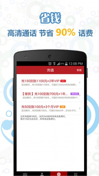 特省錢電話,2015年度值得信賴的智能省錢工具。通話流暢,音質(zhì)清晰,去電顯號/隱藏號碼隨心所欲,國內(nèi)長途低至5分錢/分鐘,會員日、夜間電話無限制免費打,下載即送60分鐘!