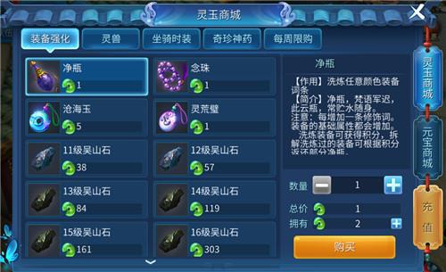 在商城系統(tǒng)中分為兩種,一種是【靈玉商城】,一種是【元寶商城】,在商城中可以購買一些常需要的東西,例如時裝、吳山石、銀兩、銀票等等。
