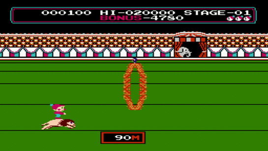 《馬戲團(tuán)》畫(huà)面雖然在當(dāng)時(shí)也稱(chēng)不上華麗,卻具有很高的趣味性。在游戲中玩家需要操縱這只小丑,通過(guò)五個(gè)關(guān)卡的考驗(yàn)。這些關(guān)卡都是大眾在馬戲團(tuán)里耳熟能詳?shù)?,比如跳火圈,空中飛人等等。當(dāng)然游戲肯定不會(huì)像現(xiàn)實(shí)中去跳火圈那么難,平易近人但卻非常到位的操作為它贏得了很多玩家青睞。游戲真正要磨練的是玩家的手指,通過(guò)對(duì)十字鍵與A鍵跳躍的精確掌控,你將很快熟悉動(dòng)作游戲的套路。
