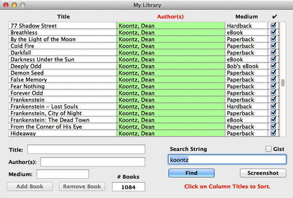 MyLibraryMac版幫助用戶管理的書籍他們的圖書館。保存每本書的數(shù)據(jù)是標(biāo)題,作者(S),中(精裝本,平裝本,電子書等),如果這本書已經(jīng)被閱讀或沒有,這本書很短的要點(diǎn)。用戶界面提供簡單的數(shù)據(jù)錄入,搜索字符串,并通過標(biāo)題,作者,媒體,或讀狀態(tài)排序。