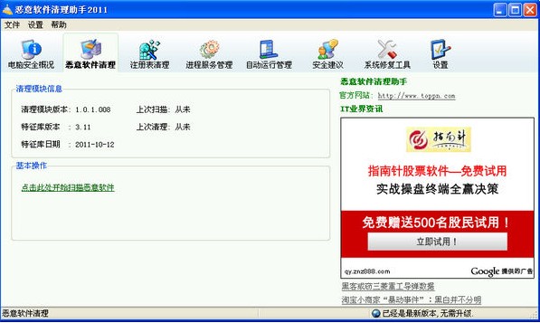 惡意軟件清理助手2012 V4.3.0.1,此版本為全新設(shè)計(jì)版本,完全兼容windows xp,windows 7等主流操作系統(tǒng),全新清理引擎,掃描速度更快,查殺惡意軟件更迅速徹底;